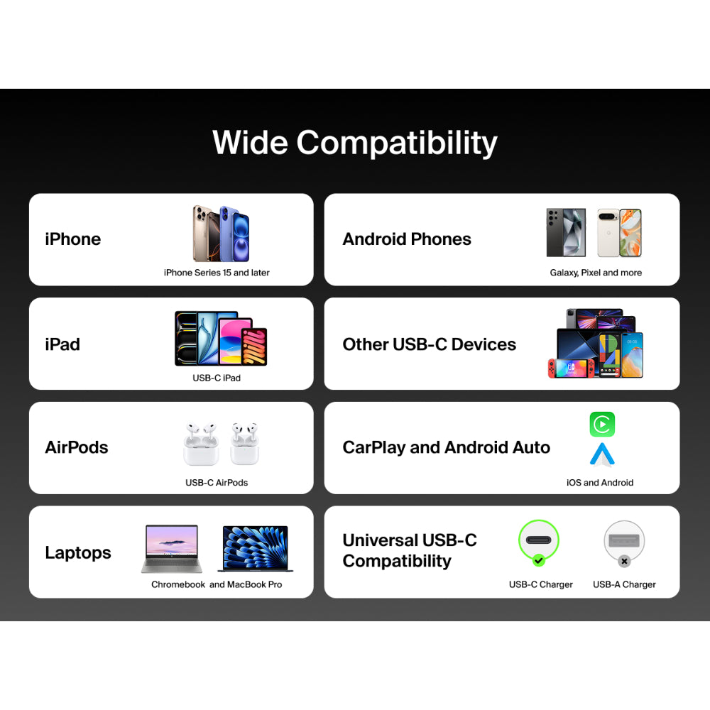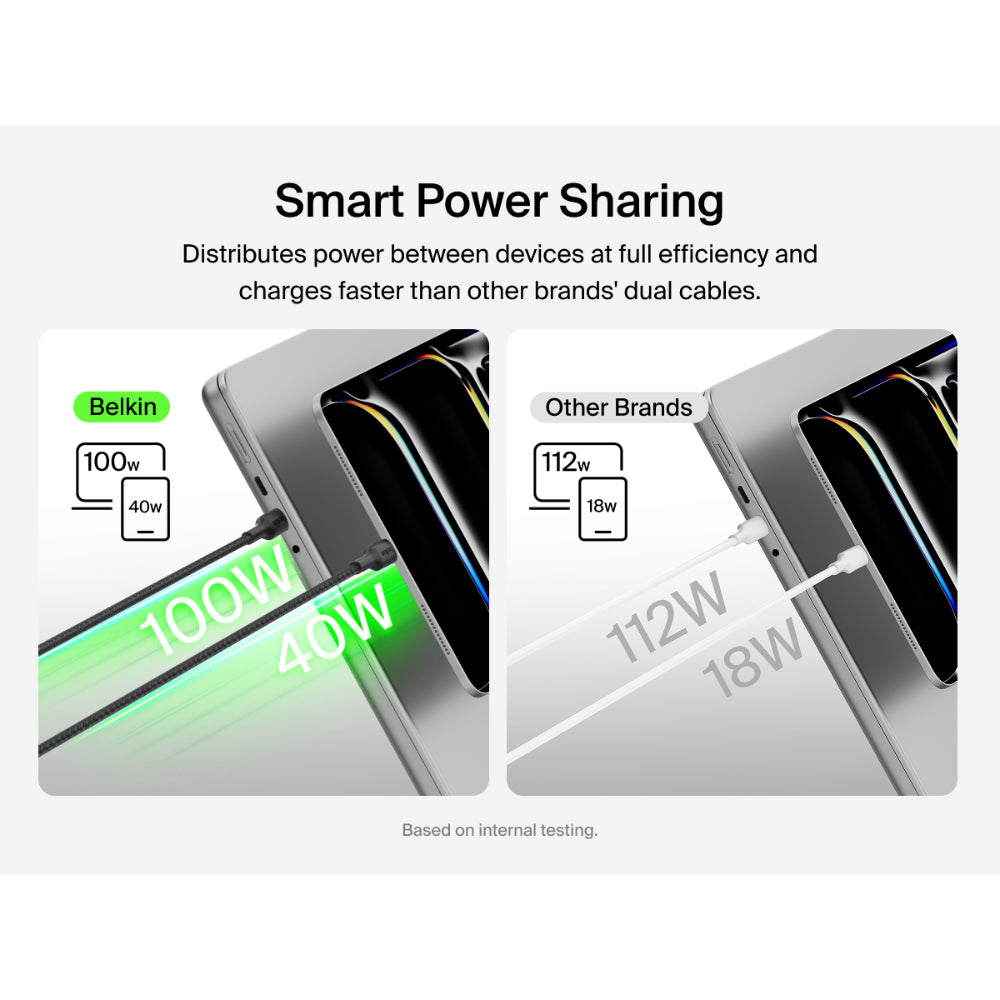 Charge one or two laptops simultaneously with a single, universally compatible cable that supports up to 140W total power. Smart Power Sharing evenly distributes power between devices to optimize efficiency. Durable, travel ready and made with recycled materials.*