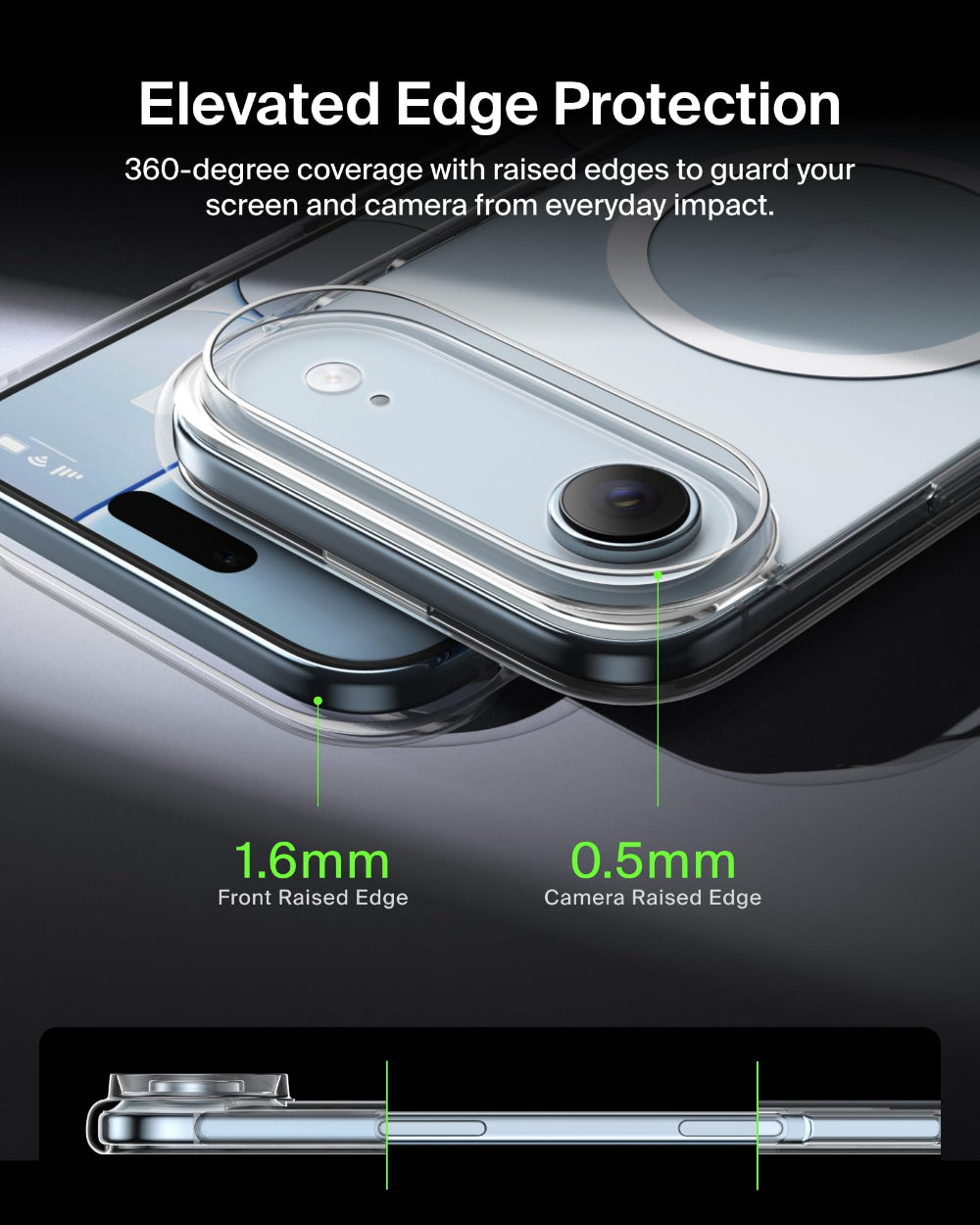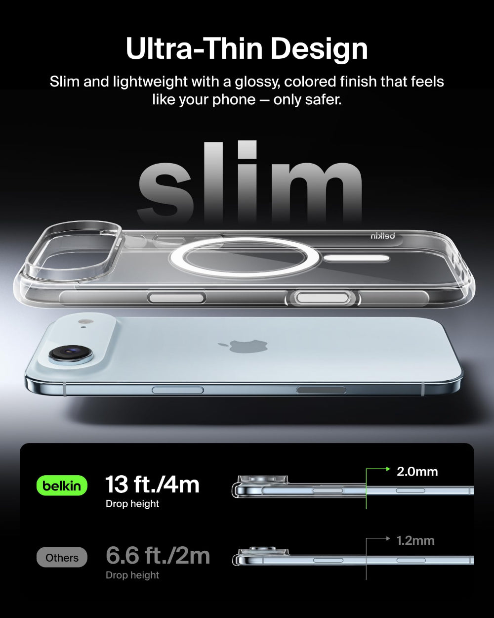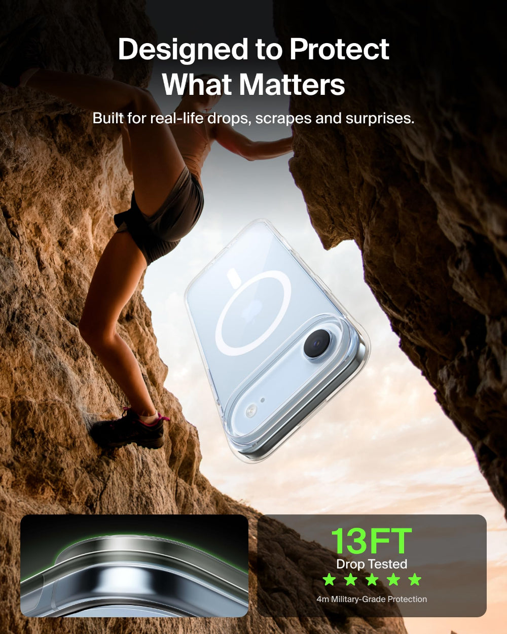 جراب Belkin SheerForce الشفاف لهاتف iPhone 17 Air احمِ هاتفك دون التنازل عن الأناقة أو الراحة مع غطاء Belkin الشفاف، المصمم ليدوم طويلاً ويسهل استخدامه يومياً. يوفر هذا الغطاء حماية من السقوط حتى ارتفاع مترين، مما يحمي جهازك من الانزلاقات والصدمات العرضية. كما توفر الحواف المرتفعة حماية إضافية للشاشة والكاميرا، خاصةً عند وضع الهاتف ووجهه لأسفل. بفضل طبقة مقاومة للخدش ومواد مقاومة للاصفرار، يبقى غطاء هاتفك شفافًا ويبدو جديدًا لفترة أطول. متوافق مع ملحقات MagSafe، مما يتيح لك وضعه وشحنه بيد واحدة بكل سهولة، كما يتميز الجانب بمقبض مريح مانع للانزلاق لراحة تدوم طويلًا. تضمن الأزرار سهلة الاستخدام وصولًا سريعًا وفعالًا إلى وظائف الصوت والطاقة والكاميرا. رغم حمايته الفائقة، يبقى الغطاء نحيفًا للغاية بسماكة 1.1 سم فقط، وخفيف الوزن ليسهل حمله في الجيب. إضافةً إلى ذلك، فهو مصنوع من 75% من مواد معاد تدويرها، ويأتي في عبوة خالية تمامًا من البلاستيك، مما يجعله خيارًا ذكيًا لك وللكوكب.