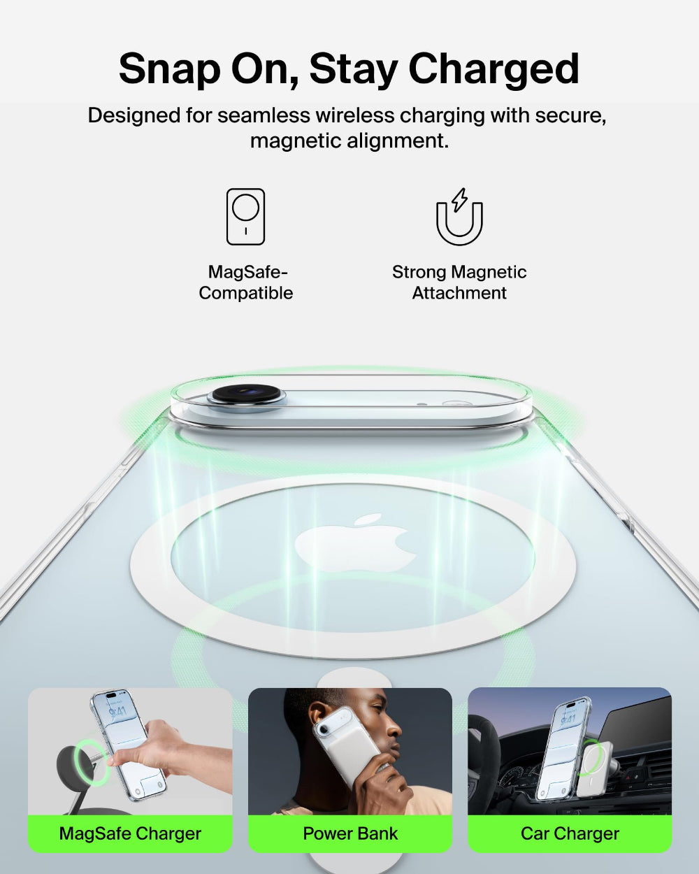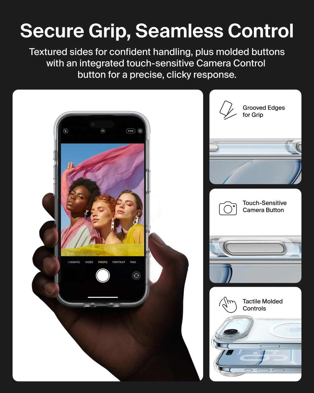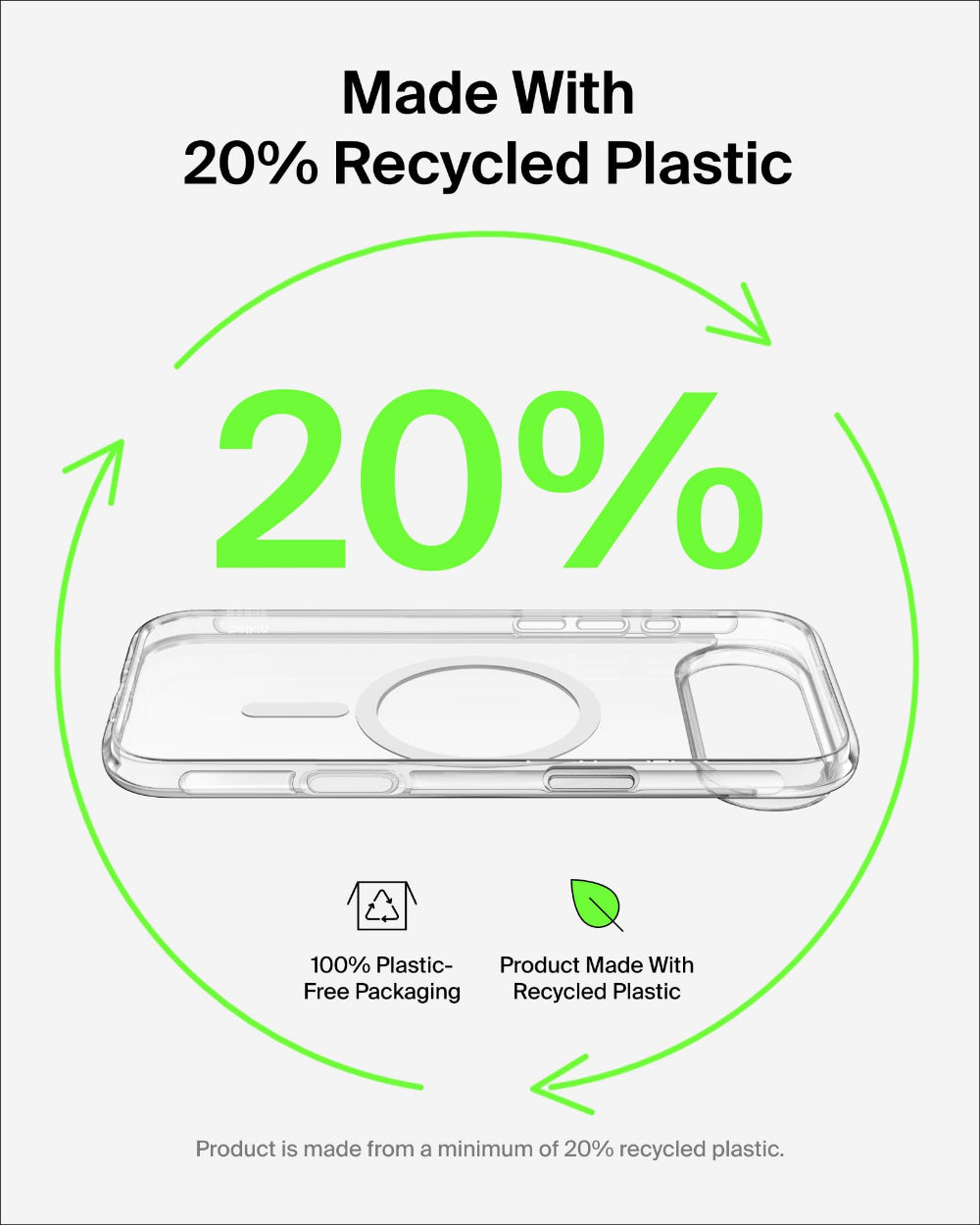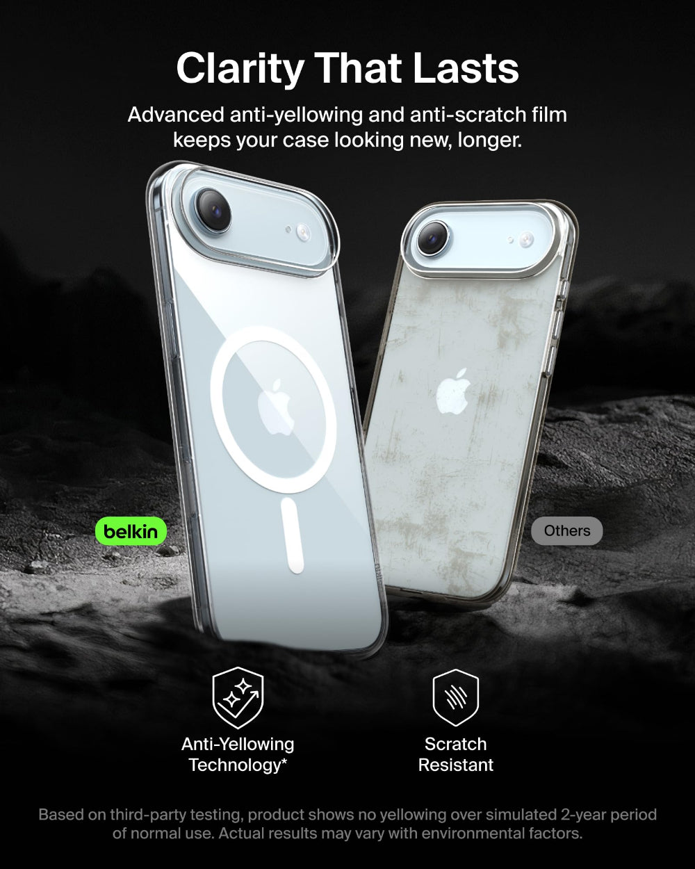جراب Belkin SheerForce الشفاف لهاتف iPhone 17 Air احمِ هاتفك دون التنازل عن الأناقة أو الراحة مع غطاء Belkin الشفاف، المصمم ليدوم طويلاً ويسهل استخدامه يومياً. يوفر هذا الغطاء حماية من السقوط حتى ارتفاع مترين، مما يحمي جهازك من الانزلاقات والصدمات العرضية. كما توفر الحواف المرتفعة حماية إضافية للشاشة والكاميرا، خاصةً عند وضع الهاتف ووجهه لأسفل. بفضل طبقة مقاومة للخدش ومواد مقاومة للاصفرار، يبقى غطاء هاتفك شفافًا ويبدو جديدًا لفترة أطول. متوافق مع ملحقات MagSafe، مما يتيح لك وضعه وشحنه بيد واحدة بكل سهولة، كما يتميز الجانب بمقبض مريح مانع للانزلاق لراحة تدوم طويلًا. تضمن الأزرار سهلة الاستخدام وصولًا سريعًا وفعالًا إلى وظائف الصوت والطاقة والكاميرا. رغم حمايته الفائقة، يبقى الغطاء نحيفًا للغاية بسماكة 1.1 سم فقط، وخفيف الوزن ليسهل حمله في الجيب. إضافةً إلى ذلك، فهو مصنوع من 75% من مواد معاد تدويرها، ويأتي في عبوة خالية تمامًا من البلاستيك، مما يجعله خيارًا ذكيًا لك وللكوكب.