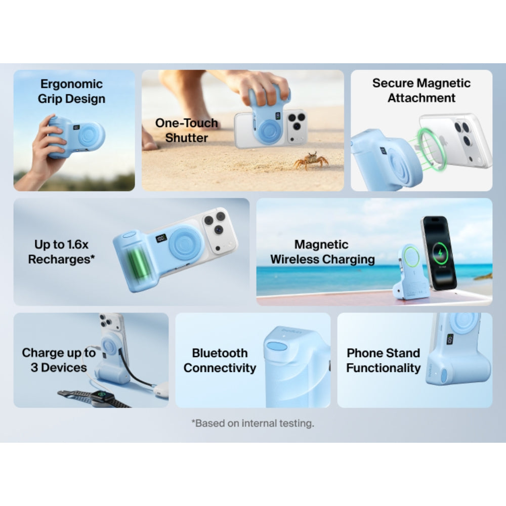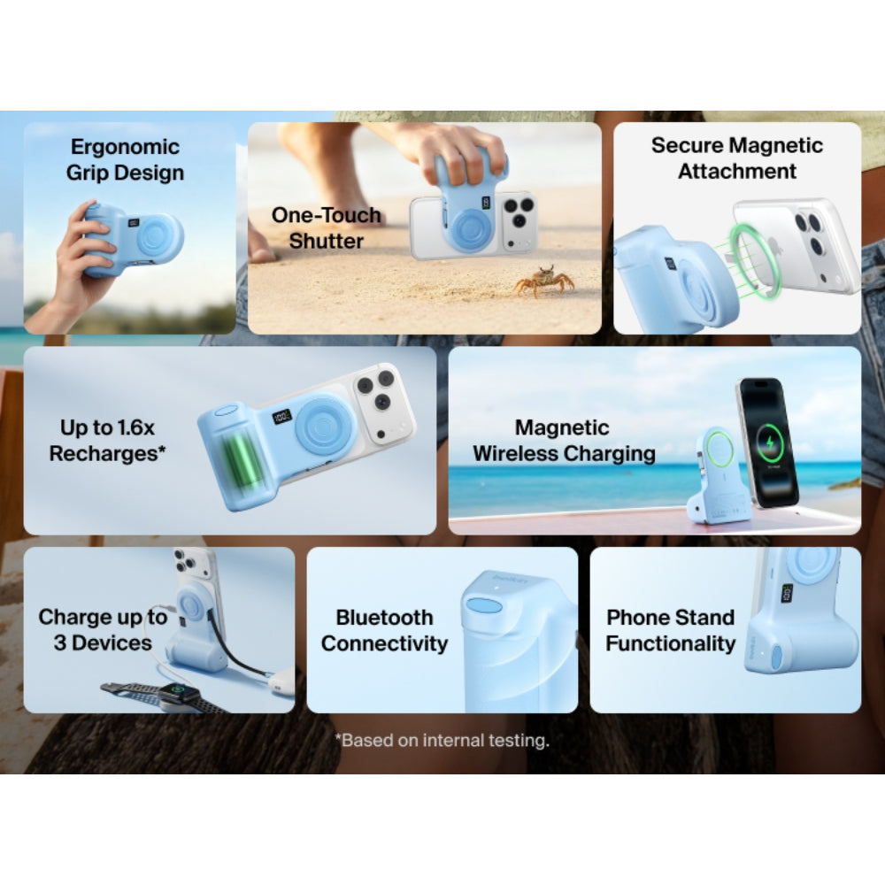 This portable camera grip transforms your iPhone into a true camera to capture steadier, smoother pictures and videos. Content creators simply snap it on magnetically and connect via Bluetooth using a button to control the shutter. Create away with a long-lasting 9.3K mAh* capacity that charges up to 3 devices. It doubles as a power bank and a phone stand in portrait or landscape mode.† Designed for vloggers, bloggers and TikTokers to create captivating content.