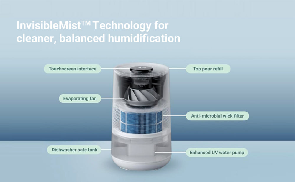 تعرّف على أول مرطب هواء ذكي لدينا، خالٍ من الرذاذ، يُعبأ من الأعلى. بفضل تقنية InvisibleMist™، ستحصل على هواء متوازن تمامًا دون أي تلف ناتج عن الماء أو غبار أبيض، مما يخلق جوًا مثاليًا لنوم هانئ. صُمم جهاز ترطيب الهواء BlueAir InvisibleMist™ للحفاظ على مستويات الرطوبة المثلى داخل المنزل، مما يُحسّن جودة الهواء. فهو يوفر رطوبة نظيفة ومتوازنة دون لزوجة أو بقايا ماء أو غبار أبيض، وذلك بفضل فلتر الفتيل المضاد للميكروبات الذي يحجز المعادن والملوثات. يتميز جهاز الترطيب بخزان مياه علوي بسعة تصل إلى 3.5 لتر، مما يوفر ما يصل إلى 48 ساعة من التشغيل المتواصل، وهو مناسب للغرف التي تصل مساحتها إلى 500 قدم مربع.