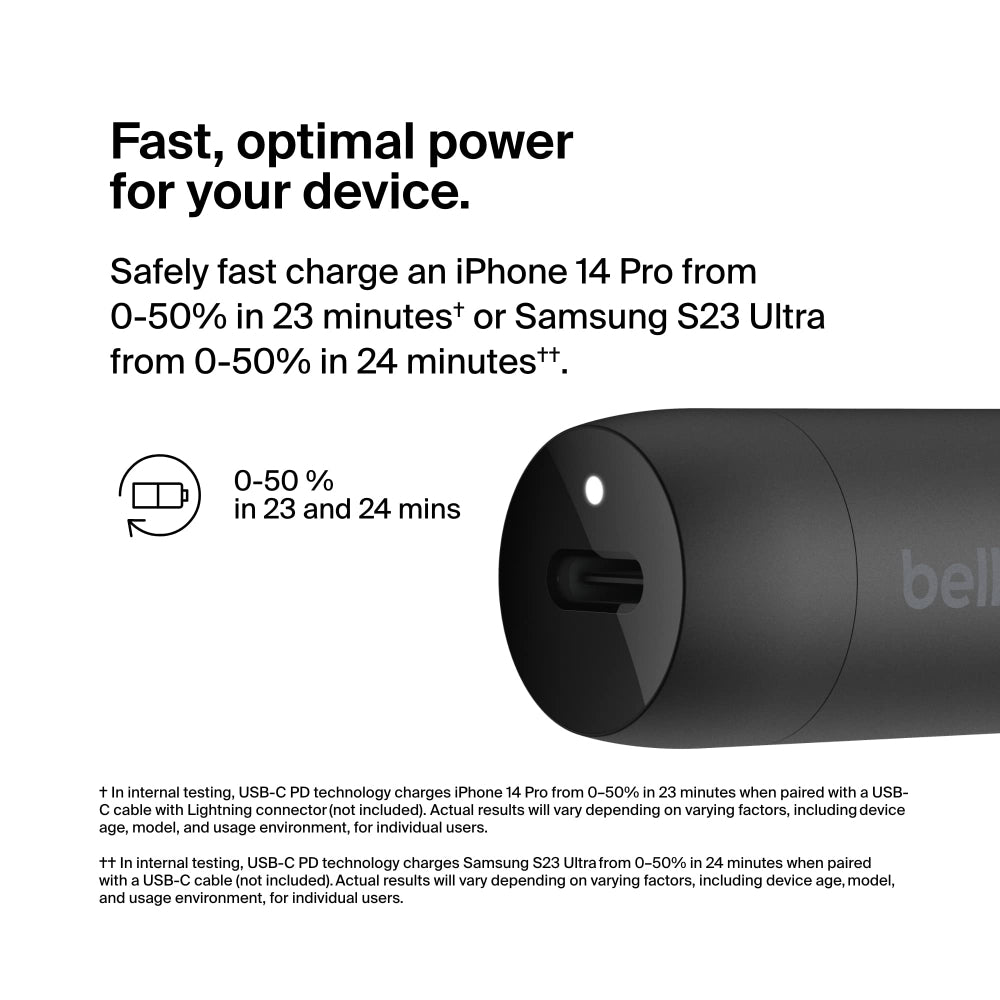 اشحن بسرعة هواتف وأجهزة آيفون وسامسونج وجوجل اللوحية باستخدام شاحن السيارة الصغير الحجم المزود بتقنية توصيل الطاقة USB-C بقوة 30 واط.