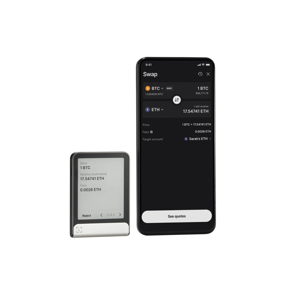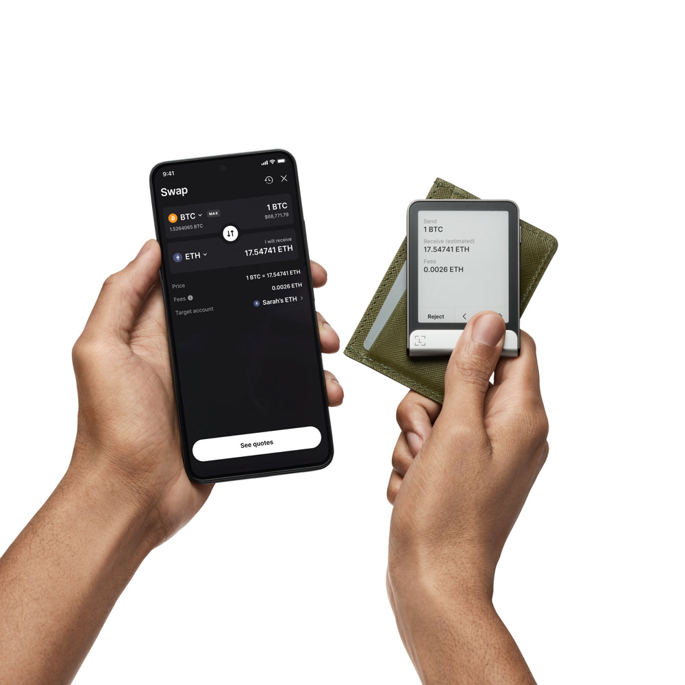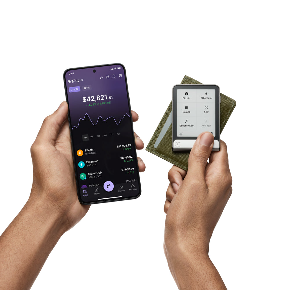 ليدجر فليكس هي محفظة ليدجر من الجيل الجديد، مزودة بشاشة لمس آمنة بتقنية الحبر الإلكتروني E Ink®. بفضل شريحة Secure Element الرائدة في الصناعة ونظام التشغيل ليدجر، استمتع بتجربة أمان سلسة على أول شاشة لمس آمنة في العالم. صُممت المحفظة ببساطة فائقة مع مراعاة راحتك وسهولة استخدامها، لتستمتع بسهولة التمرير والنقر على شاشة لمس آمنة تمامًا. يمكنك توصيل ليدجر فليكس بهاتفك الذكي الذي يعمل بنظام iOS أو Android أو جهاز الكمبيوتر المكتبي لتجربة استخدام سهلة وسلسة في أي مكان. احمِ محفظة ليدجر فليكس وخصصها باستخدام ملحقات ليدجر ماجنت فوليو (تُباع منفصلة)، لتضمن لك الأمان والأناقة في تصميم أنيق.