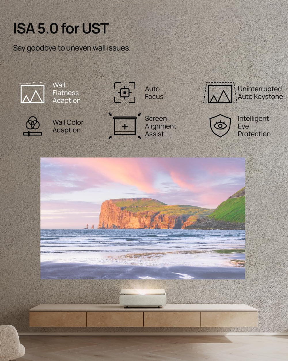 • تقنية العرض فائق القصر : اعرض صورة شاشة ضخمة بحجم 100 بوصة من مسافة 17.8 سم فقط من الحائط، وذلك بفضل نسبة العرض المتقدمة 0.177:1، وهي مثالية لأي حجم غرفة.