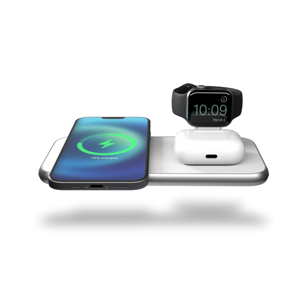 تتيح وحدة Apple Watch المدمجة شحن ساعتك الذكية أثناء وضع السكون، بالإضافة إلى شحن هاتفك iPhone وسماعات AirPods. يتميز هذا الشاحن بتصميم أبيض أنيق وفاخر مصنوع من الألومنيوم عالي الجودة، مما يجعله يندمج بسلاسة في أي مكان.