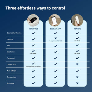 Blueair's ComfortPure 3-in-1 is the most powerful triple-function air purifier designed to look good and perform to your preferred comfort year round. The TripleFlow Hot&Cool Technology features three unique outlets, which are designed to always deliver purified air through all three boosted modes of heating, cooling, and purifiying. Independently evaluated for safety standards and third-party tested for performance as part of the AHAM Verifide® Program for air cleaners, the fast purification takes only 12.5 minutes to clear the air, removing 99.97%** of all airborne pollutants down to 0.1 microns. Easy control with direct User Interface, app or through the Blueair app; 350 degree oscillation, Night and Eco mode for ultimate personalization and comfort.