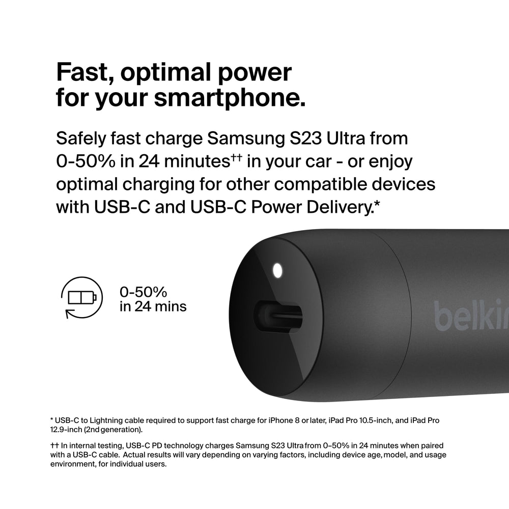 Quickly charge Samsung and Google phones, and tablets, with our compact USB-C Power Delivery-equipped 30W car charger with USB-C cable included.