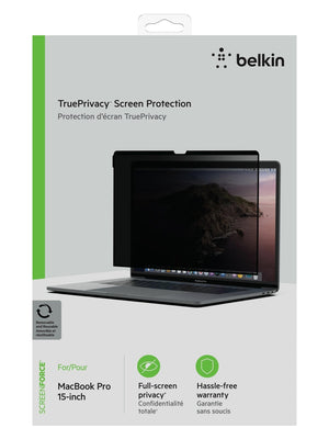 The Belkin ScreenForce Family - Maximum privacy concentrated into the thinnest possible element. SCREENFORCE is engineered to look and feel like the screen it protects, preserving clarity and sleep-mode capability for a barely-there experience. Consumers can protect their privacy while using their MacBook, even in public spaces. Designed to allow users to work while keeping their screen from prying eyes from either side. A removable and reusable privacy screen can easily be put on and stored on the included TruePrivacy Panel.