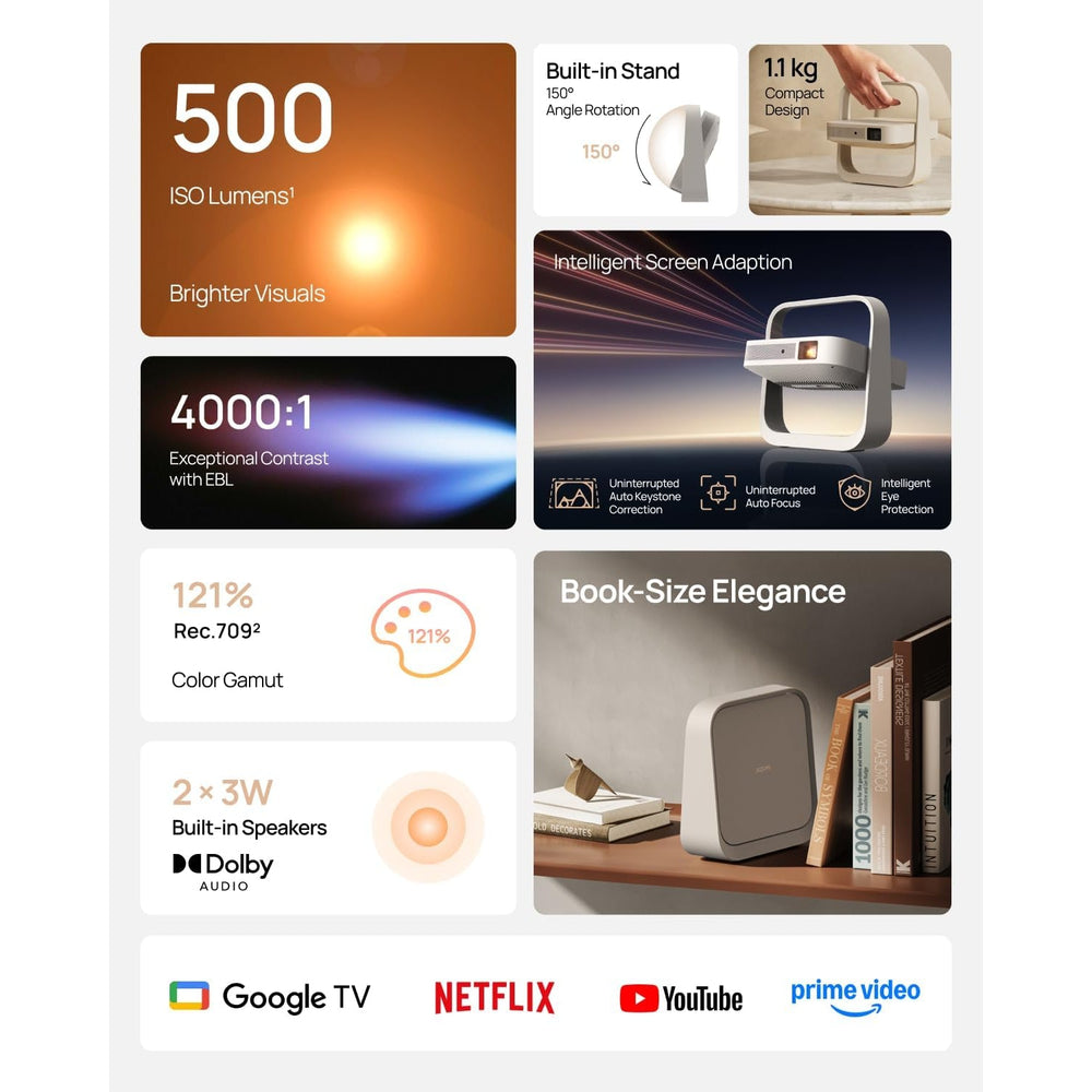 The Elfin Flip Plus is a compact, book-sized portable projector that delivers bright, vivid Full HD (1080p) visuals with up to 500 ISO lumens of brightness and enhanced contrast for crisp, lifelike picture quality. Powered by Google TV with licensed Netflix and access to thousands of apps, it transforms any room into a versatile entertainment hub — from movies and shows to gaming and streaming. Its smart design includes a built-in adjustable stand that lets you project at any angle, Intelligent Screen Adaption (ISA) for auto-aligned images, uninterrupted auto focus and keystone correction, and intelligent eye protection that dims the image when someone gets close to the lens. With dual 3W speakers, easy connectivity (Wi-Fi, Bluetooth, HDMI, USB), and an image size of up to 200″, the Elfin Flip Plus makes immersive, plug-and-play entertainment simple and stylish.