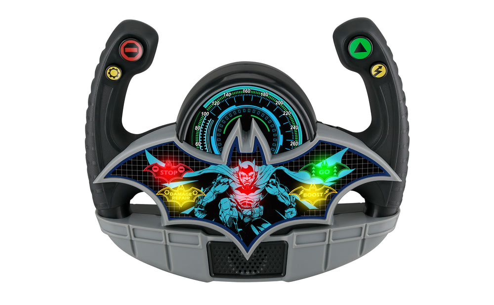 Ready to drive the Batmobile? Go on the ultimate crime-fighting adventure with your favorite superhero, Batman! It’s easy to play along using the kid-friendly controls designed for children aged 3 and up. Feel the steering wheel rumble and react to each play pattern, while cool sound effects add to the fun! Plus, you can connect your MP3 player to the aux speaker and listen to all your favorite music, too!